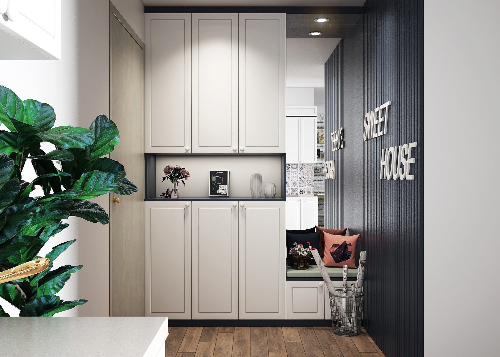 Căn hộ có diện tích 84 m2, tầng 25, tòa Spring, dự án Goldseason, Nguyễn Tuân. Theo yêu cầu từ chị Lan Anh, căn hộ được thiết kế và thi công theo phong cách hiện đại, trẻ trung, và đem một chút thiên nhiên vào căn hộ của mình.