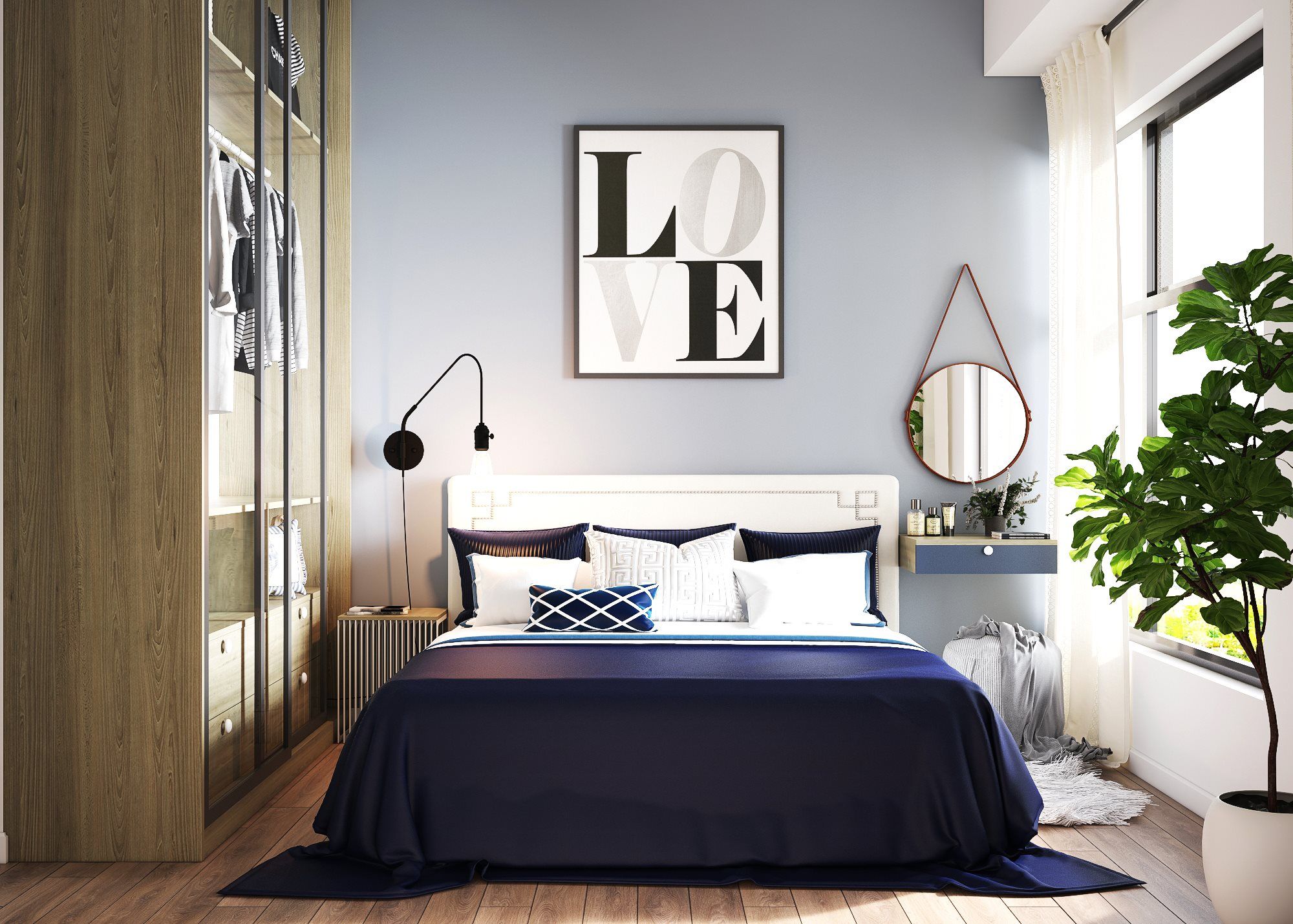 Căn hộ được thiết kế chia phòng lại, với một phòng ngủ dành cho trẻ con theo phong cách mở. Các hạng mục gỗ dùng chất liệu gỗ công nghiệp MDF cốt xanh chống ẩm.